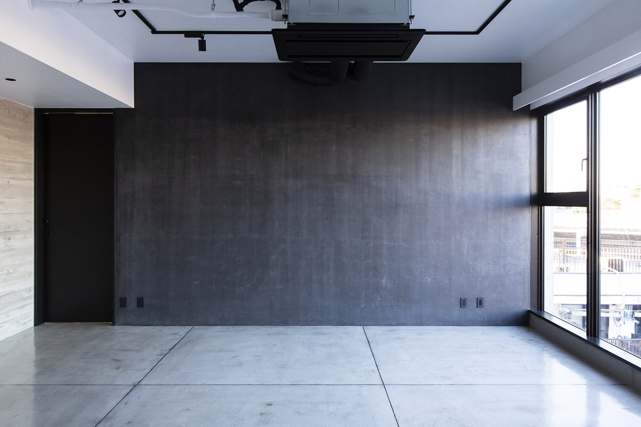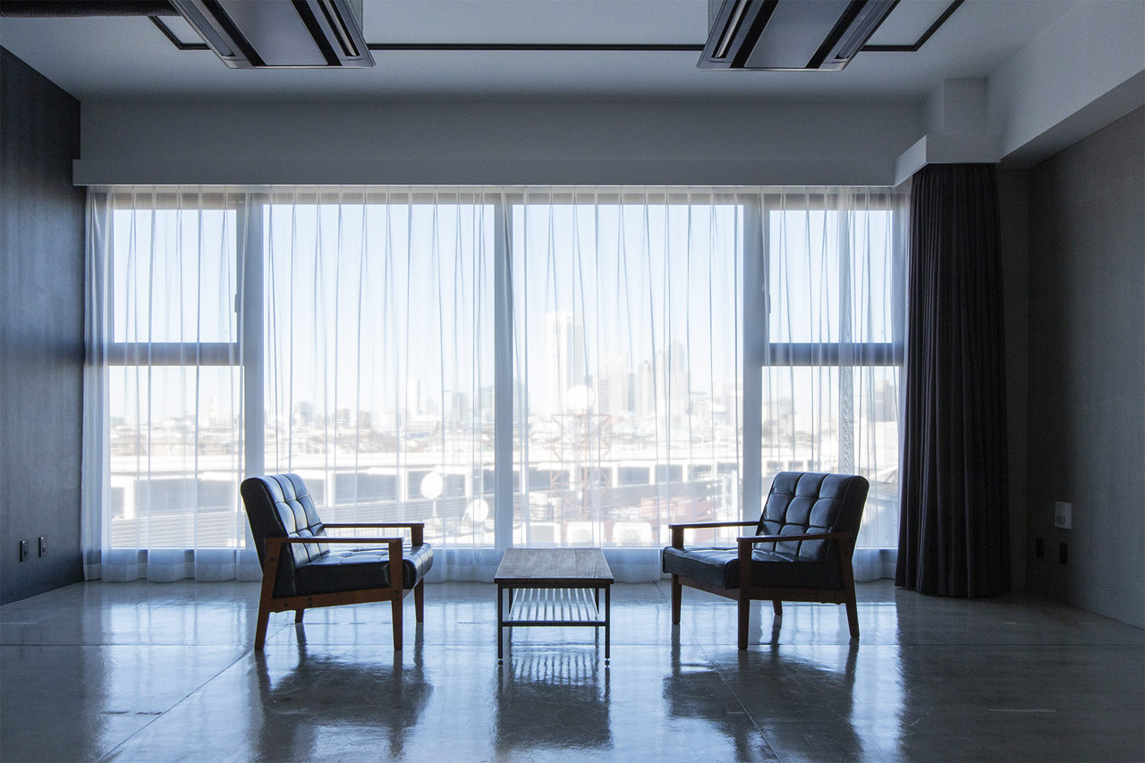 新宿副都心を一望できる全面窓に、モルタル・ブラック・グレーを基調としたマットでシンプルな雰囲気が特徴の会場です。広さは35㎡。什器の配置変更も可能な、自由度が高い展示スペースです。