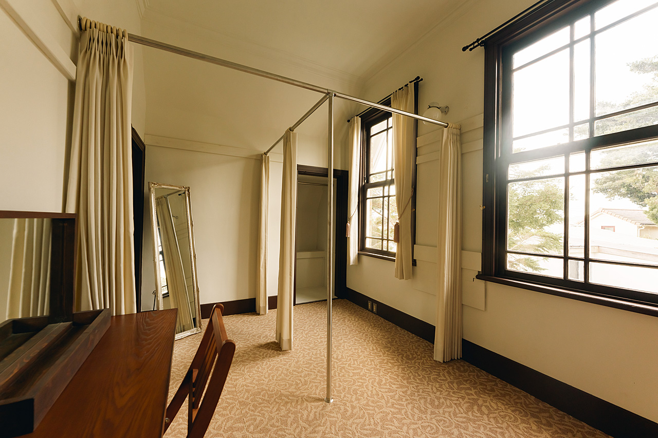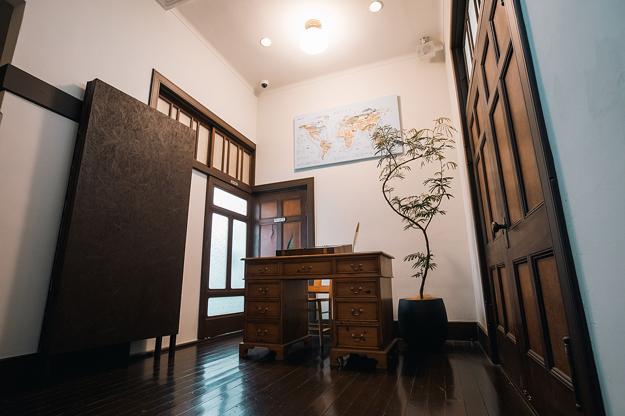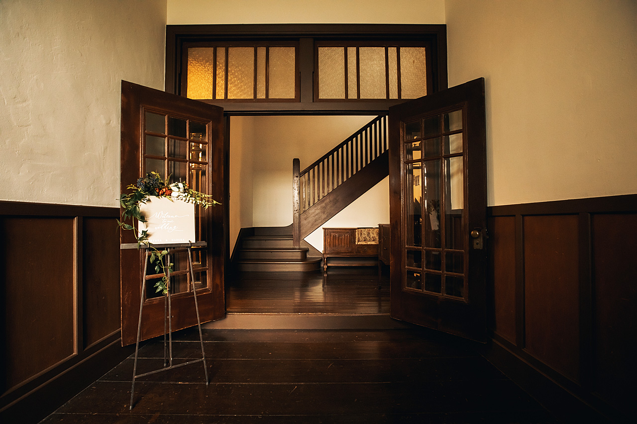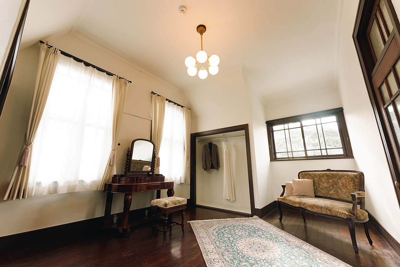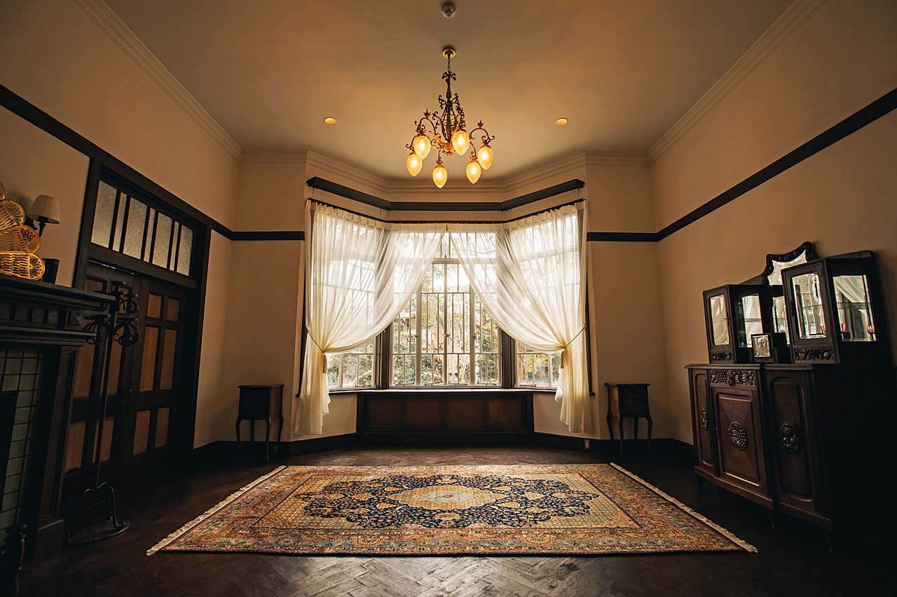 レンガの壁や瓦屋根、格子窓などの外観や、重厚感滲み出る建具、味のあるタイル張りのフロア、室内に配置されたヴィンテージ家具が印象的な室内と、会場全体からその歴史と趣を感じられる会場です。