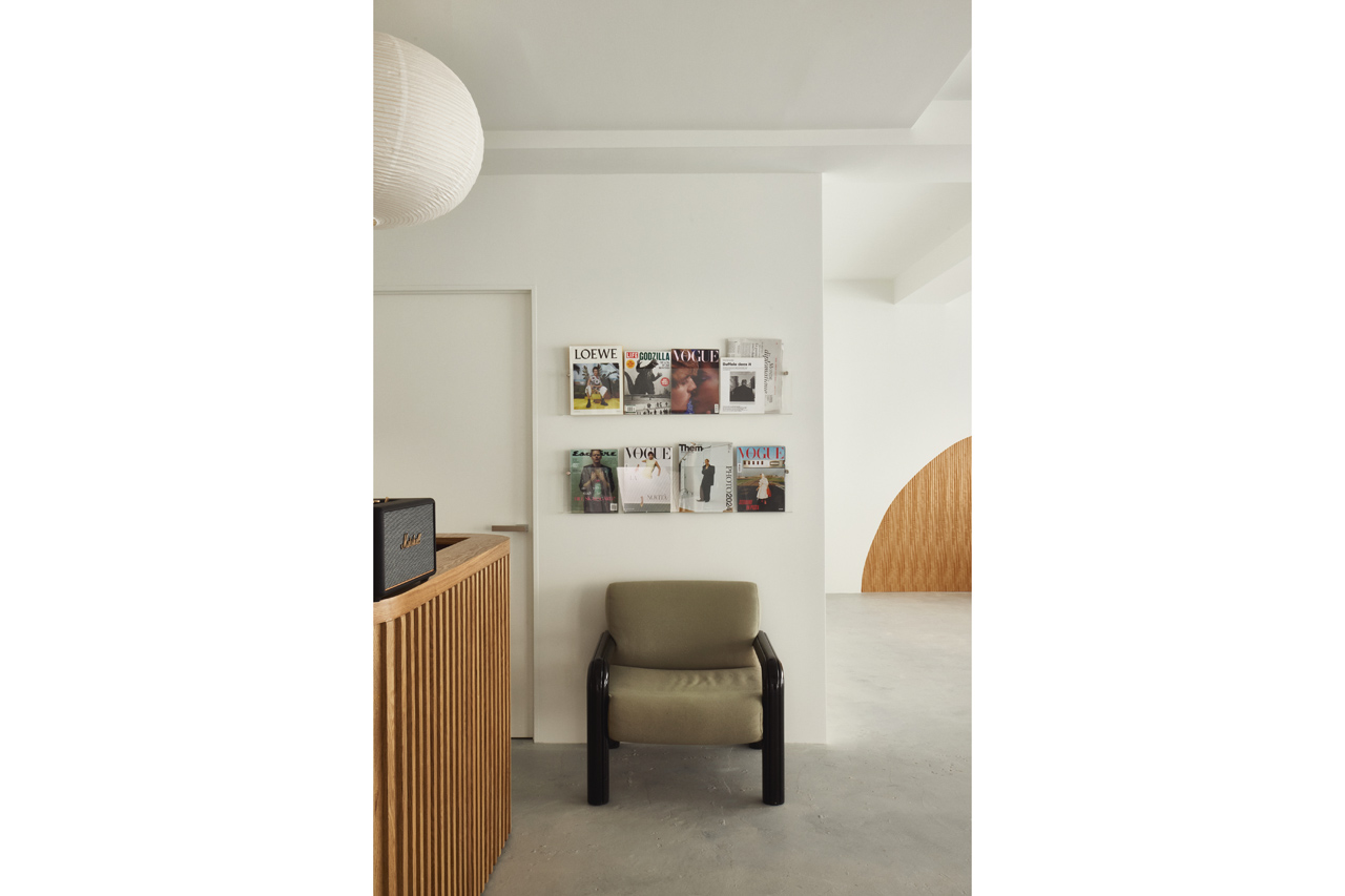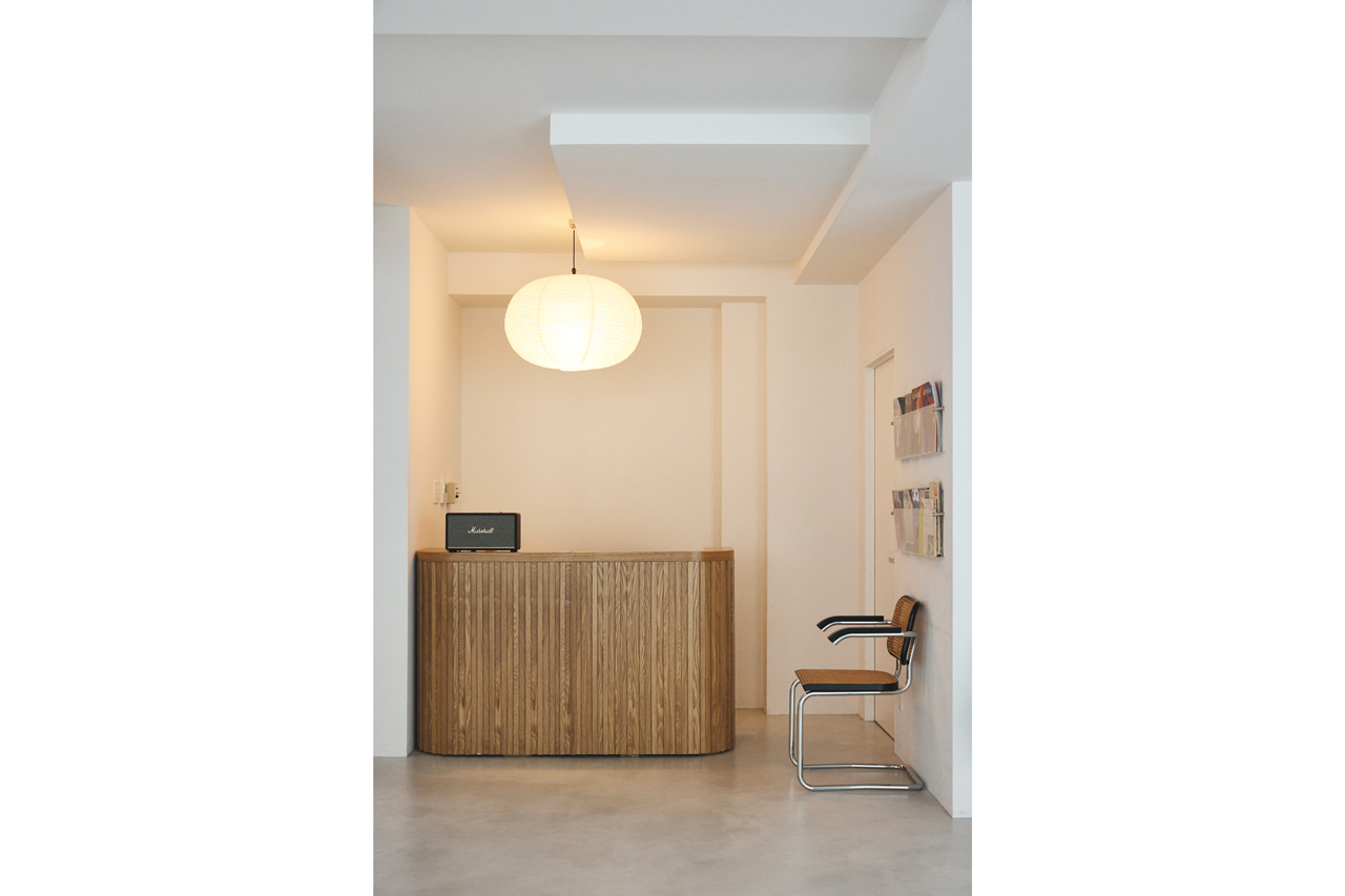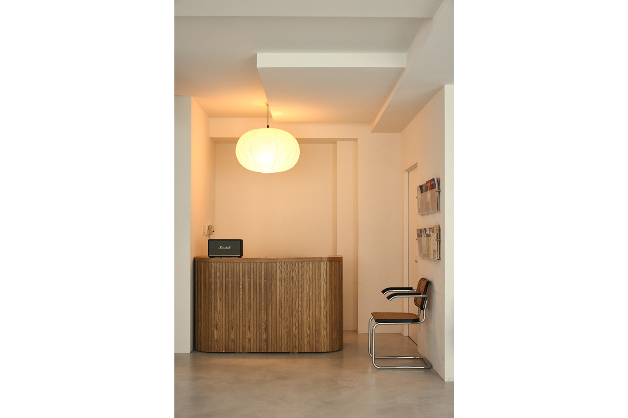 白を基調とした内装にクリーンなモルタルフロア。上質な木製のカウンターや曲線を描いたチーク柾目仕上げのインテリアが上品なアクセントとなっています。