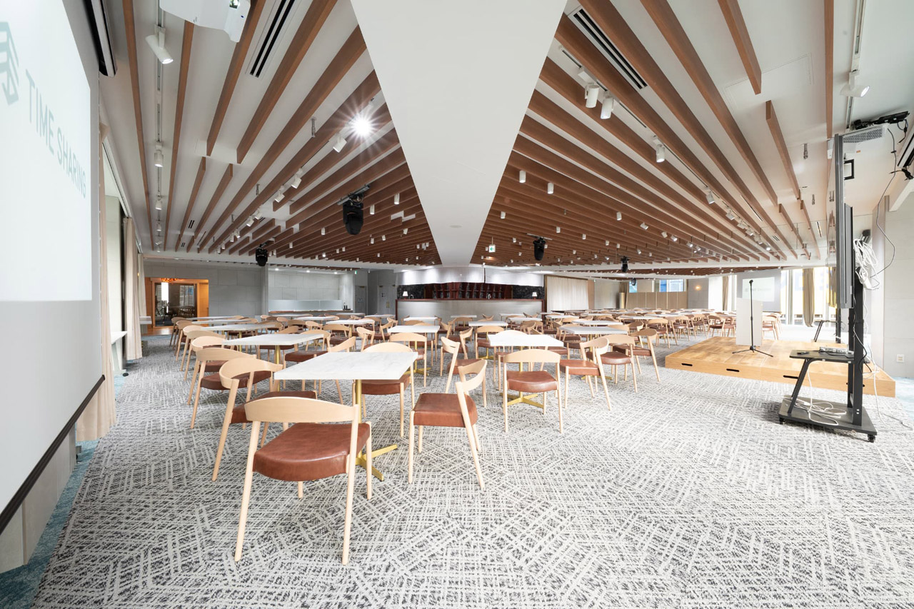 広さ385.7㎡、半立食利用最大300名収容のイベント会場には受付、バーカウンター、控室2部屋、喫煙所を完備。音響・マイク・プロジェクター・スクリーンなど充実した備品も揃うパーティスペースです。