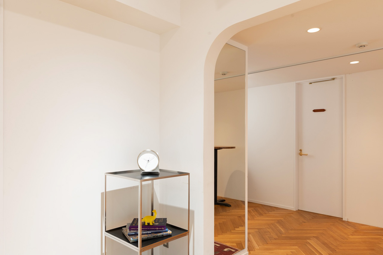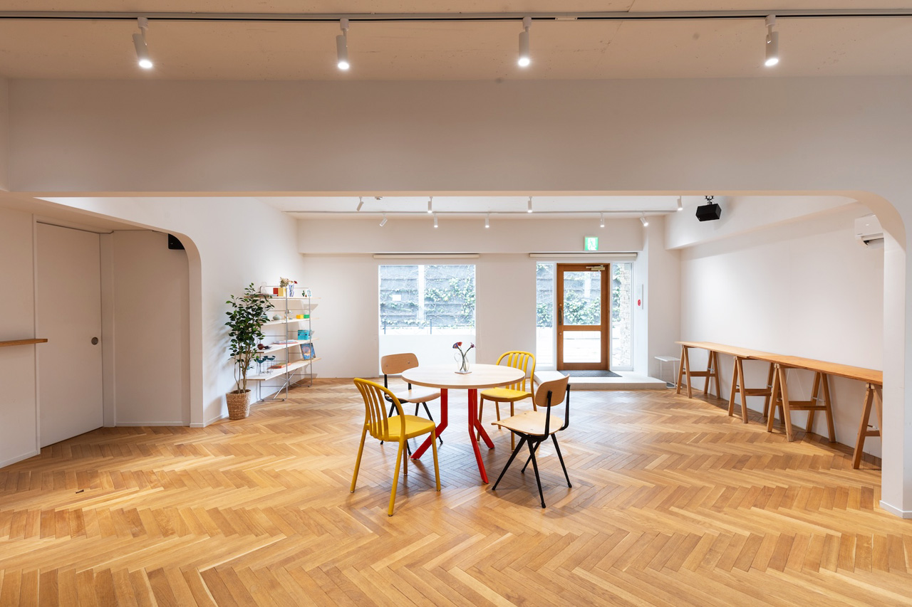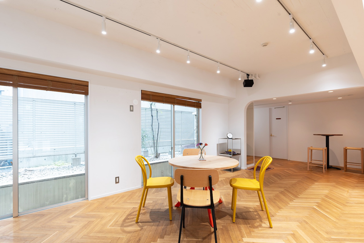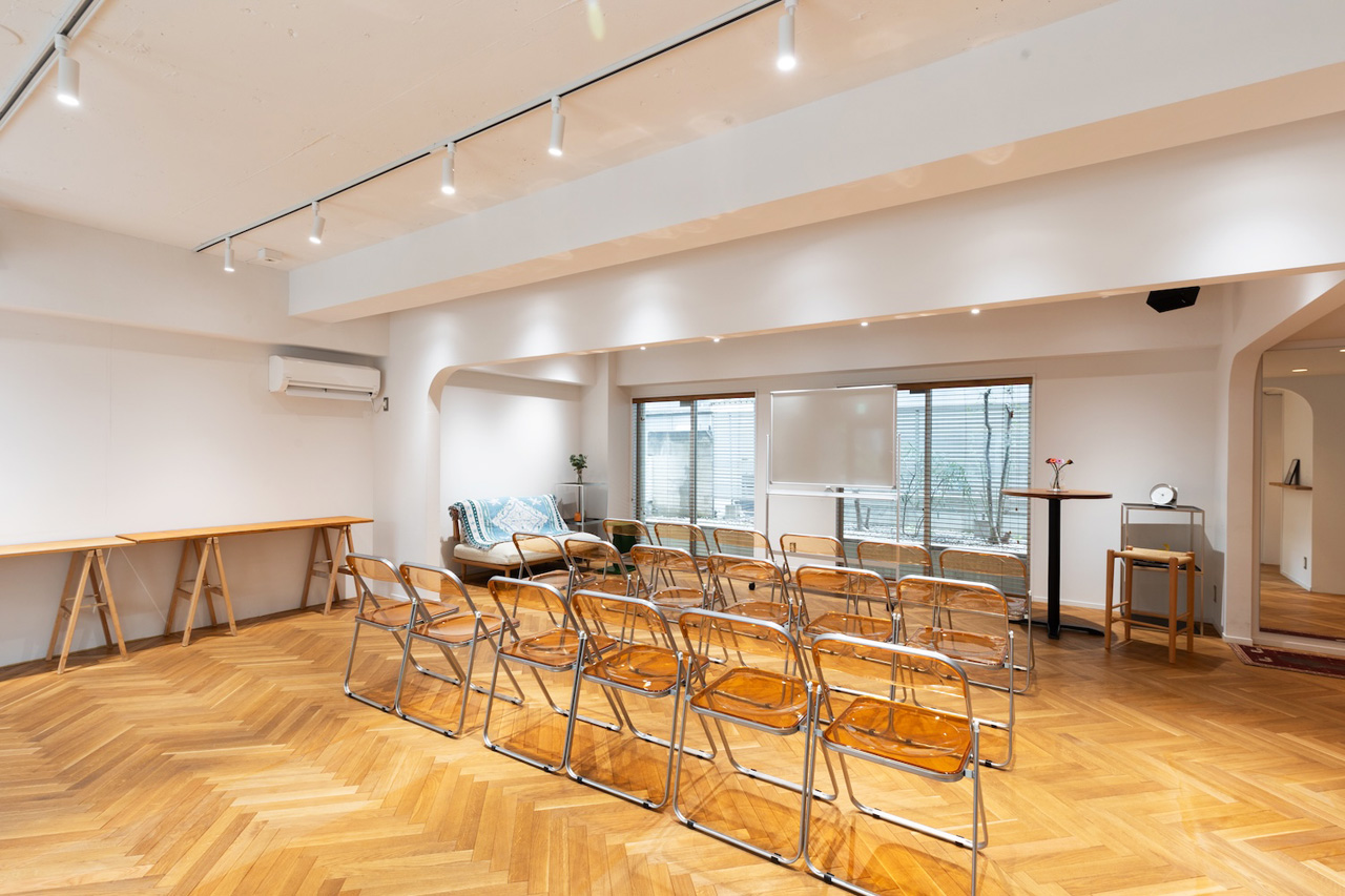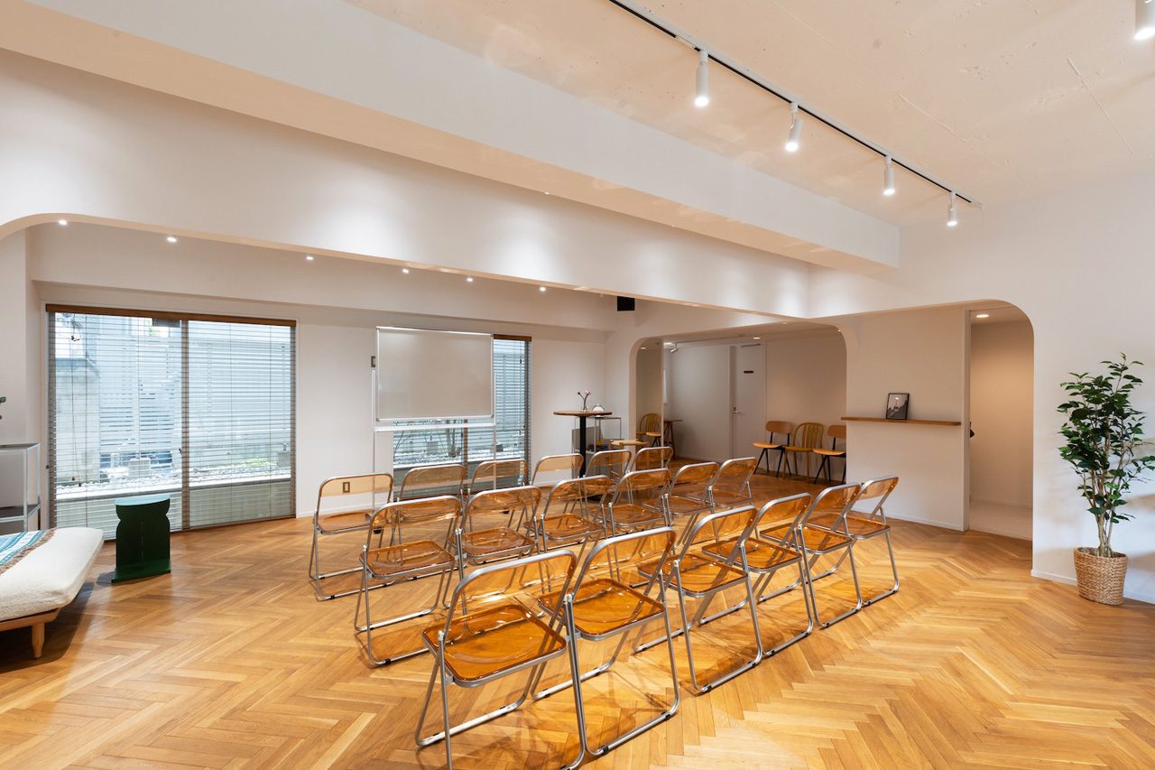 石壁とガラス張りの外観、白壁にヘリンボーンのウッドフローリング、そして要所に設けられたRのついた壁が印象的な会場です。広さは74.46㎡、最大収容可能人数は30名。什器の配置やレイアウト変更も可能な、自由度が高い会場スペースです。