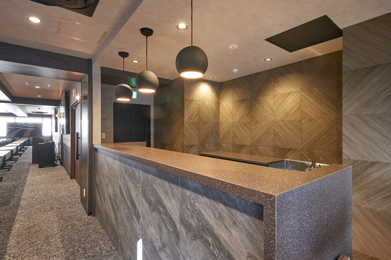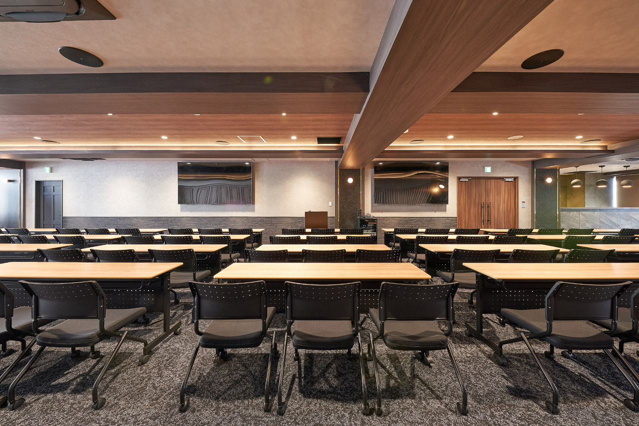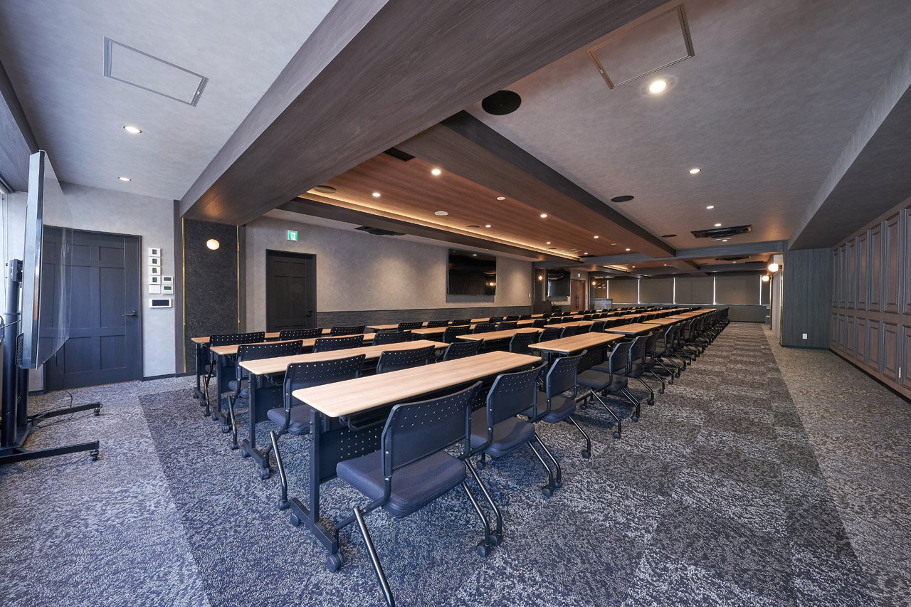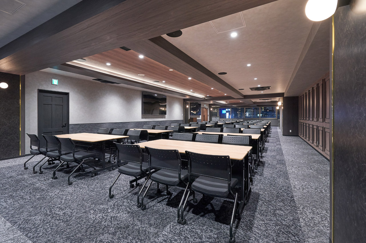 シックなモノトーンを基調とした落ち着いた雰囲気を持つ貸し会議室スペースです。広さ183㎡、着席で120名、立席で150名のサイズ感。多様なレイアウトに対応できる広さです。可動レイアウトや設備の組み合わせ変更のご相談も可能なイベントスペースです。