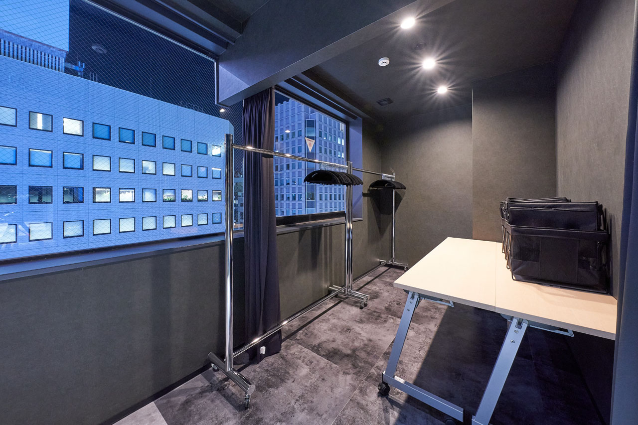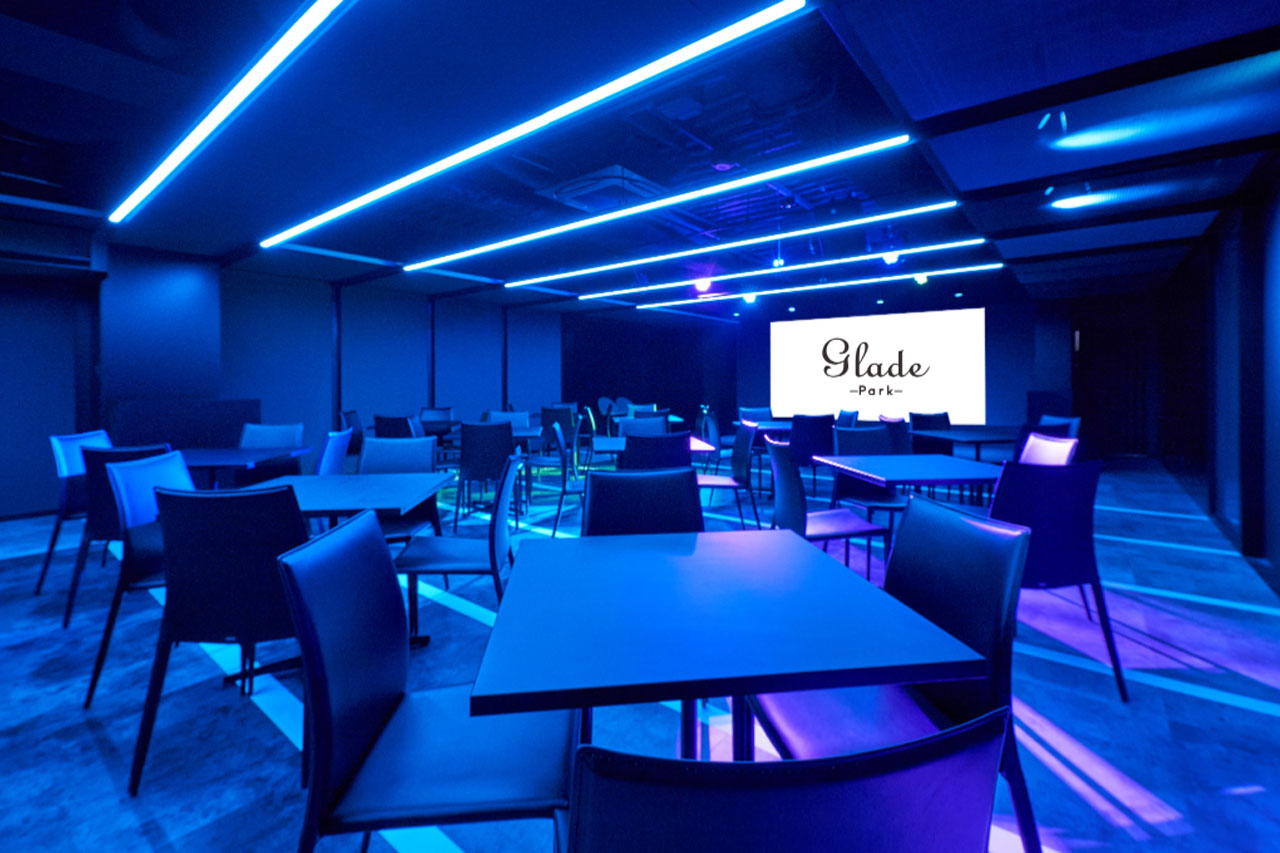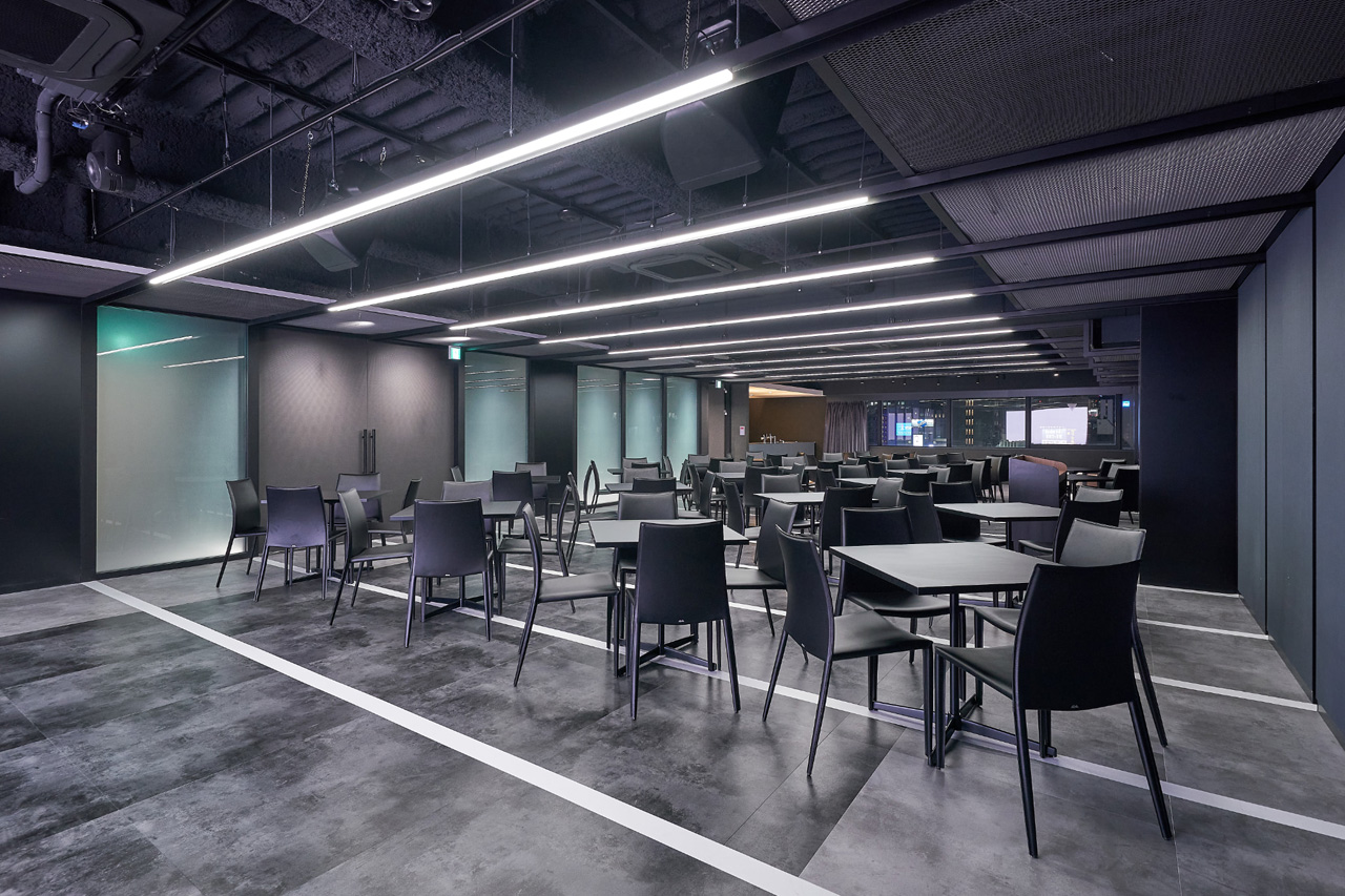 グレートーンを基調としたスタイリッシュでモダンな雰囲気を持つパーティスペースです。広さ197㎡、着席で84名、立席で130名のサイズ感。多様なレイアウトに対応できる広さです。可動レイアウトや設備の組み合わせ変更のご相談も可能なイベントスペースです。椅子やテーブル、ハンガーラックなど備品も充実しており、控室も複数備えているため様々な形式に対応できる仕様です。