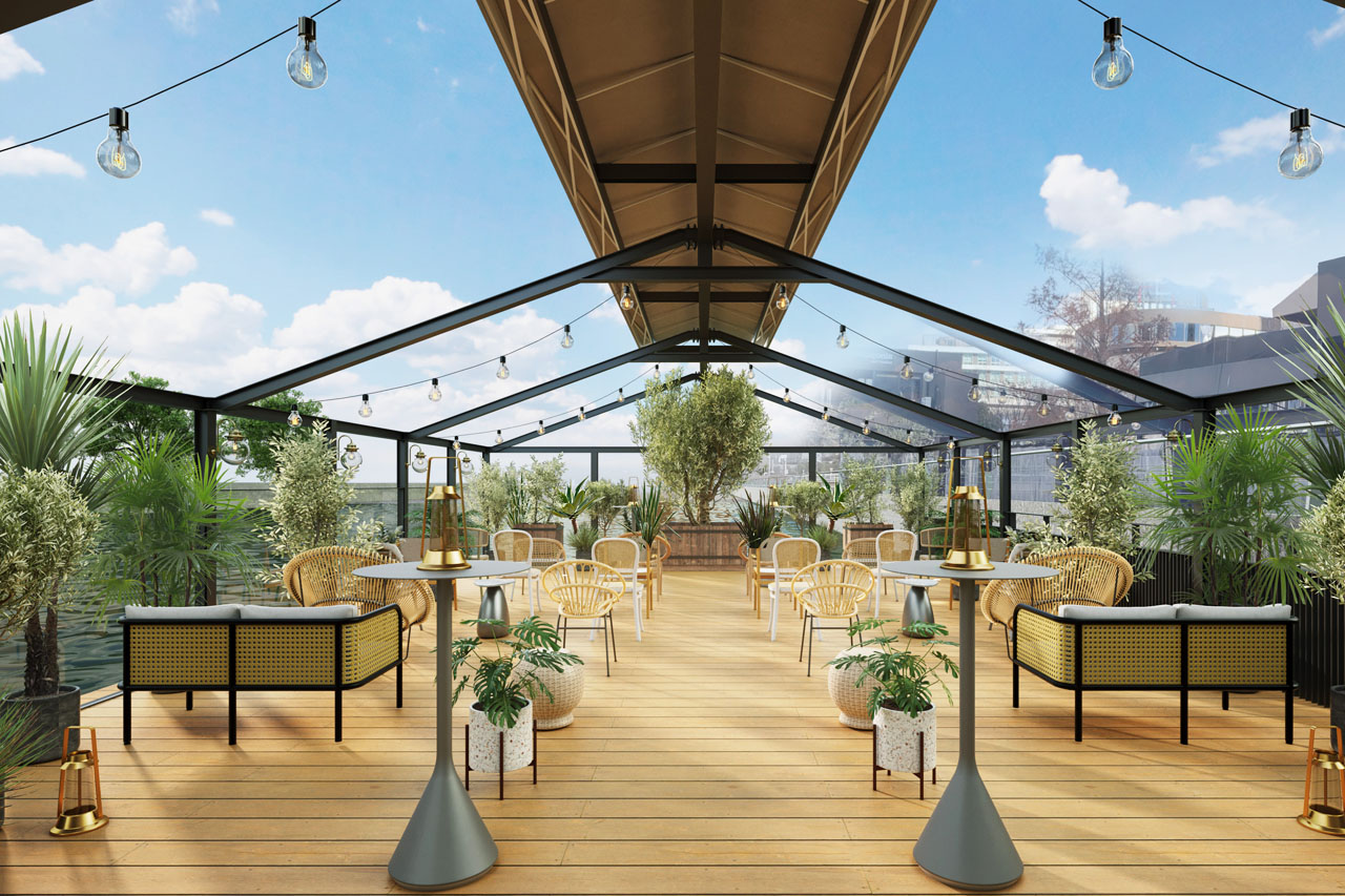 堂島川に面した水上テラスが非常に印象的なイベントスペースです。屋外に広がる開放感抜群のテラススペースと、白を基調とした室内スペースが連続する構成となっており、ダイニングルーム、リビングルームとあわせた3エリアで構成されています。全体の広さは約260㎡。屋内外を使い分けることで、用途や進行に応じた柔軟なレイアウトが可能です。
