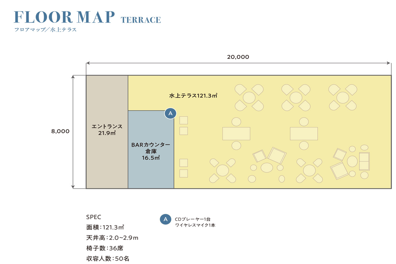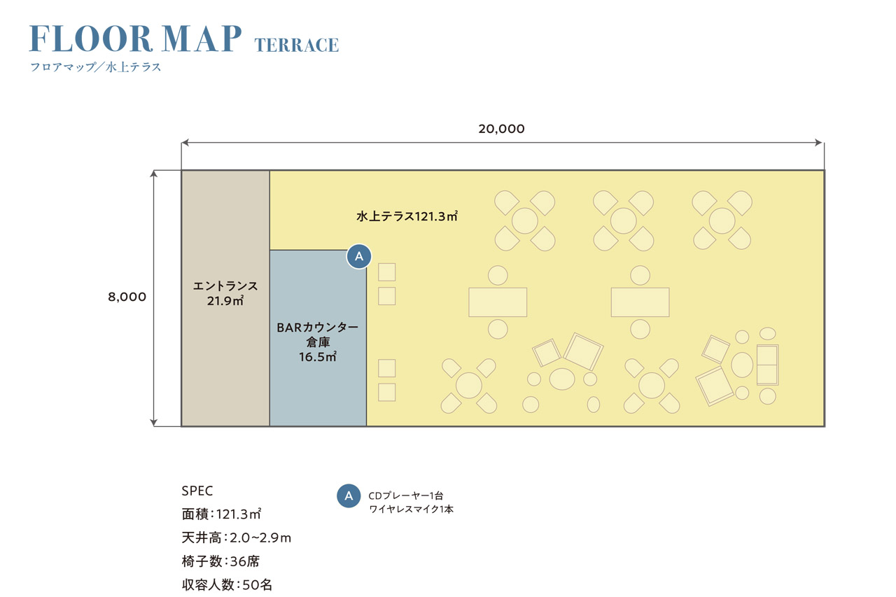 PRイベント、展示会、レセプションパーティ、撮影などでの利用に適しています。屋内空間と水上テラスを組み合わせることで、受付、展示、交流など用途ごとの使い分けがしやすく、イベント構成に幅を持たせることができます。
