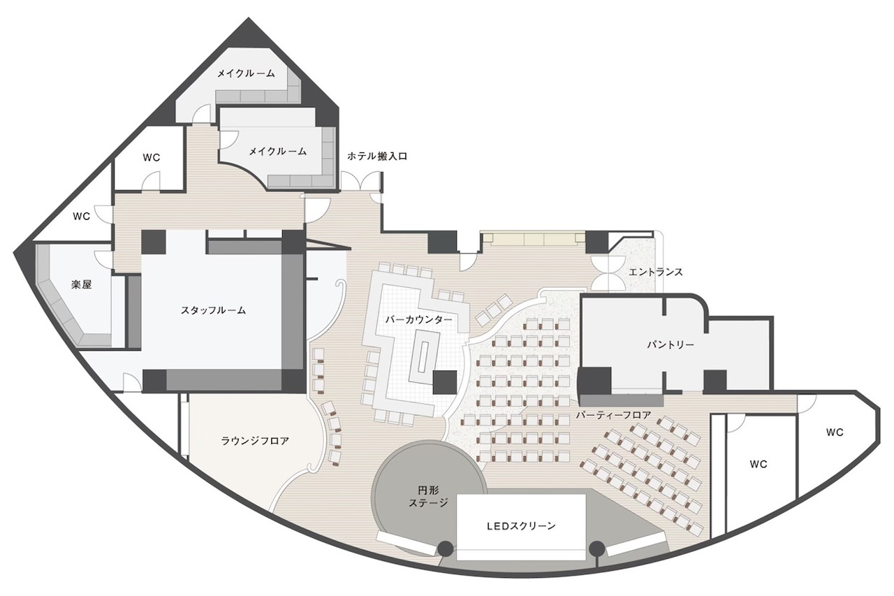 上質な内装、ホテル内という環境そして約300インチの大型LEDビジョンと4面一体型ビジョンを完備した設備を活かしてのプロモーションイベントや、レセプションパーティ、撮影利用での利用がオススメの会場です。