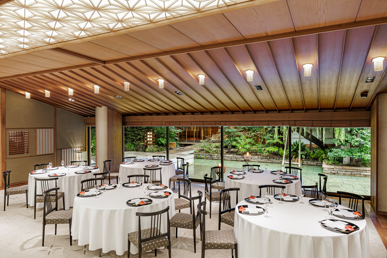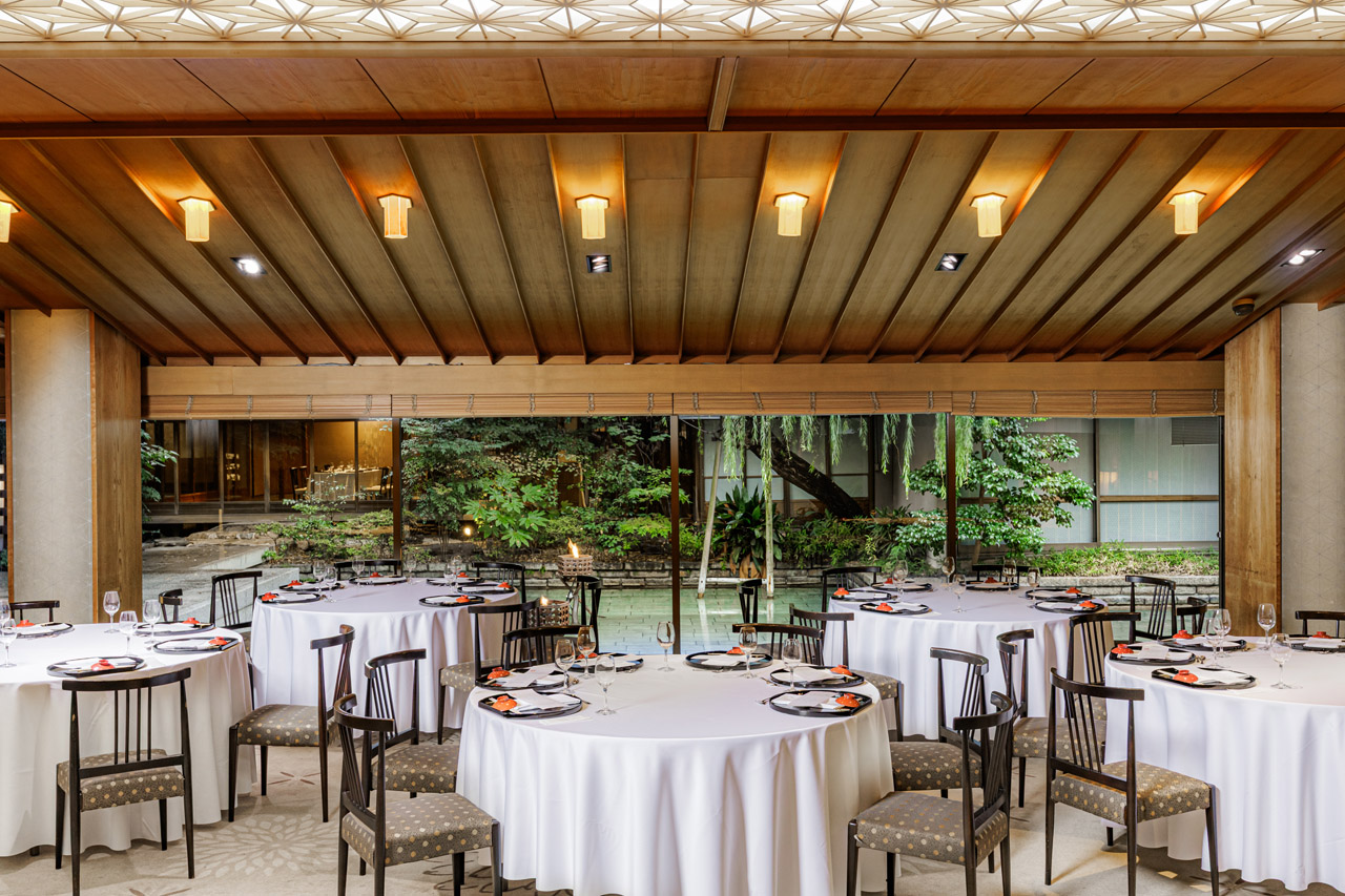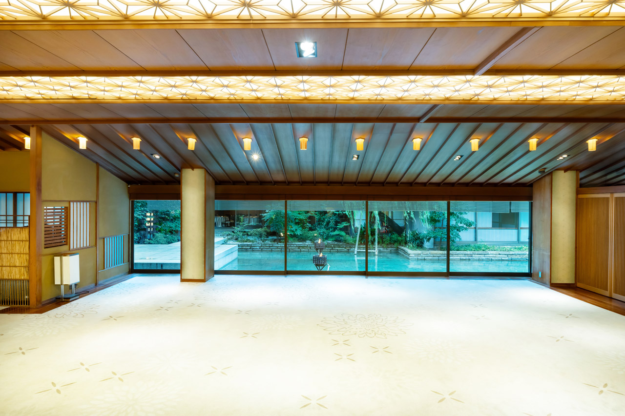 歴史を持つ旧料亭座敷跡のモダンな日本建築と、自然光が差し込む木材とガラスを活かした開放的で上質な空間の室内が調和した会場です。広さは127㎡、最大収容可能人数は約200名。複数のバンケットルームと日本庭園を備えた歴史的価値を誇る会場スペースです。